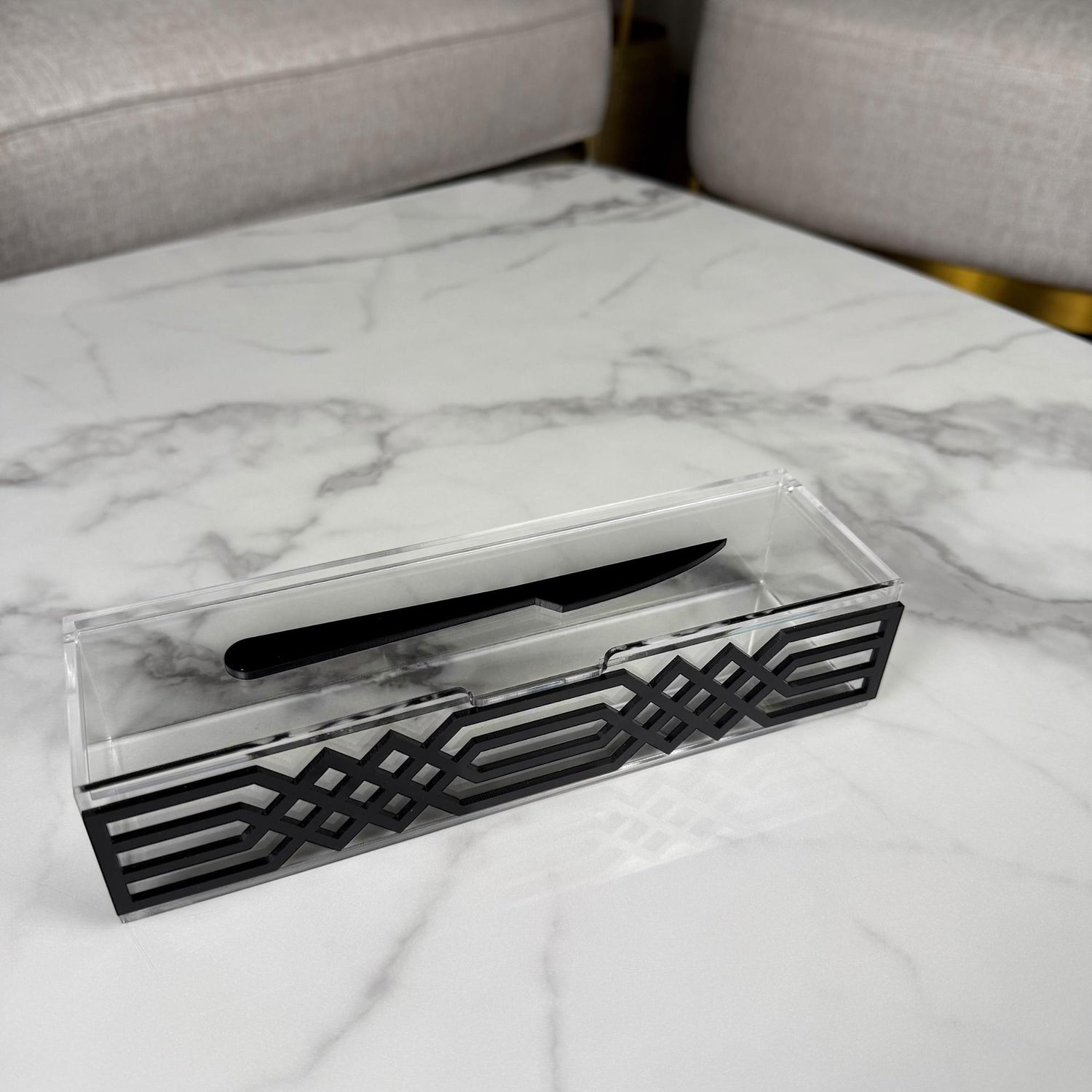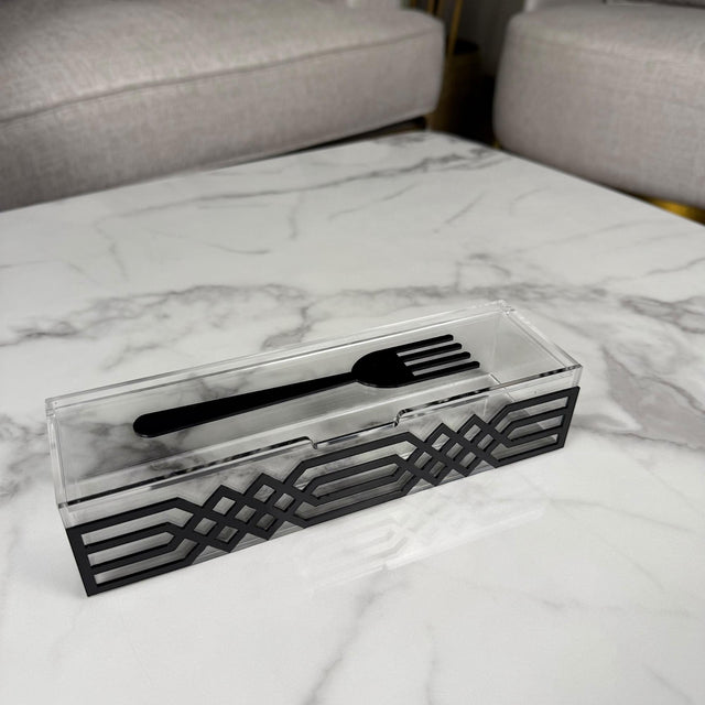 منظّمات مميزة لأدوات السفرة بتصميم هندسي فخم بإطار أسود أنيق. كل قطعة مصنوعة من الأكريليك الشفاف والسميك، وتعطي لمسة فاخرة مرتبة لركن التقديم. متوفرة بثلاث أنواع لأدوات السفرة الأساسية.