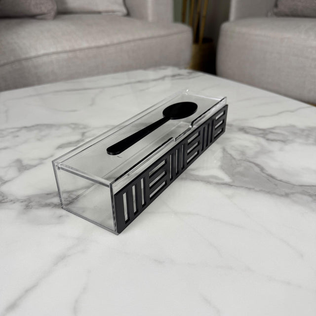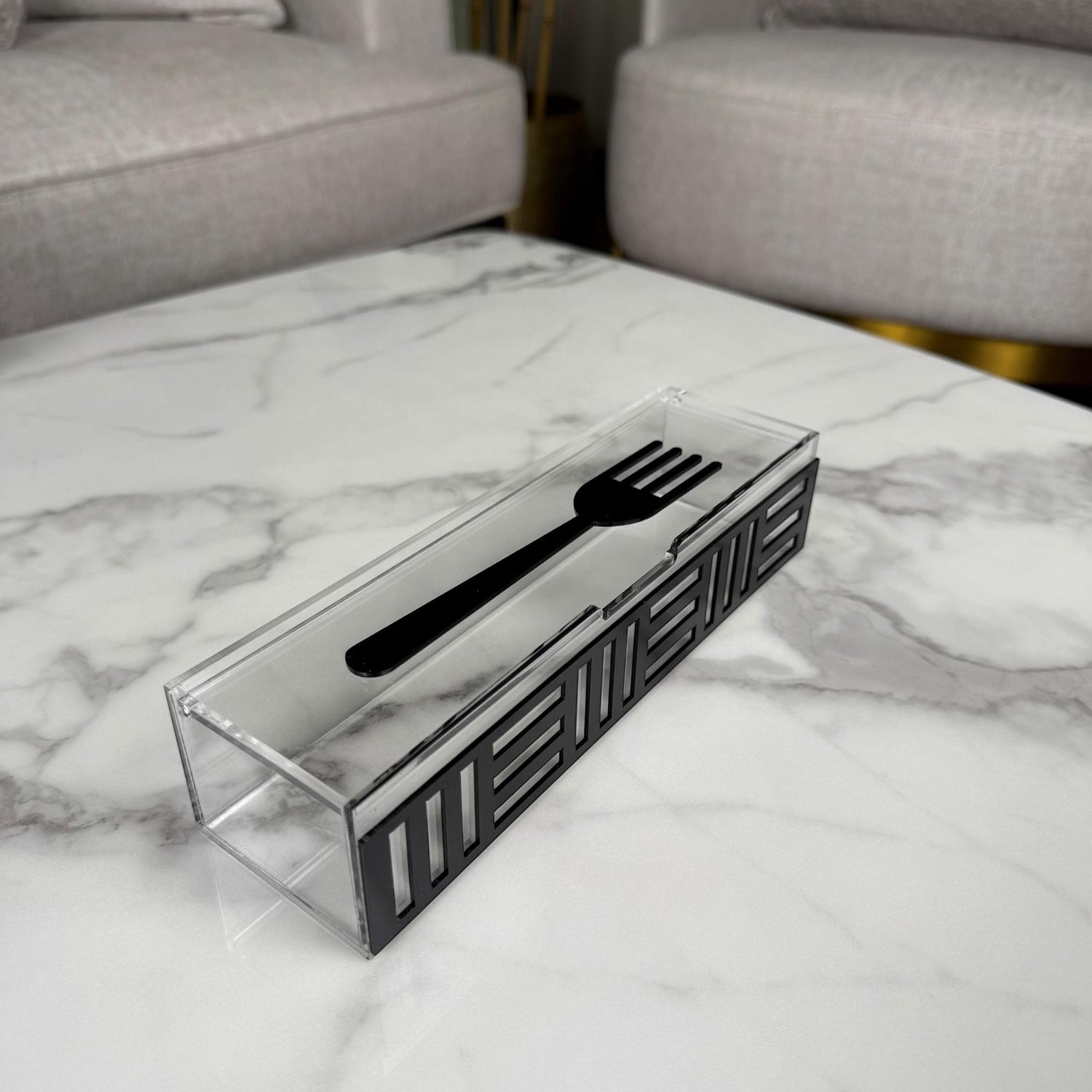 ميّزي في تنظيم ركن الضيافة مع هالمنظّم الفاخر المصنوع من الأكريليك الشفاف، والمزيّن بإطار زخرفي باللون الأسود. تصميم أنيق يحفظ كل قطعة (ملعقة، شوكة، سكين) بشكل نظيف ومرتّب. خيار مثالي للتقديم الفاخر أو كهدية مرتبة.