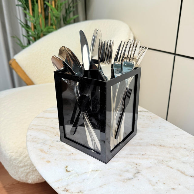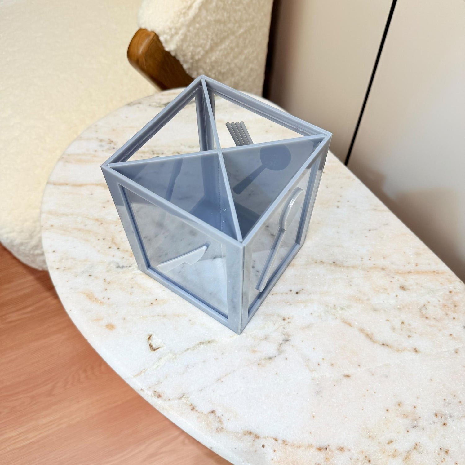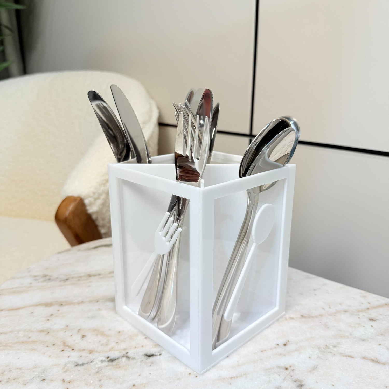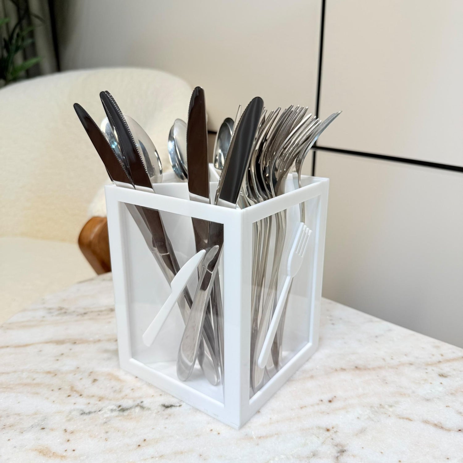 منظّم مكعب أنيق وعصري، مصمّم لتقسيم أدوات السفرة بشكل عملي ومنظّم. يحتوي على أربع خانات داخلية لحفظ الشوك، السكاكين، والملاعق بطريقة مرتبة وسهلة الاستخدام. متوفر بثلاث ألوان تناسب كل ذوق وكل ركن.