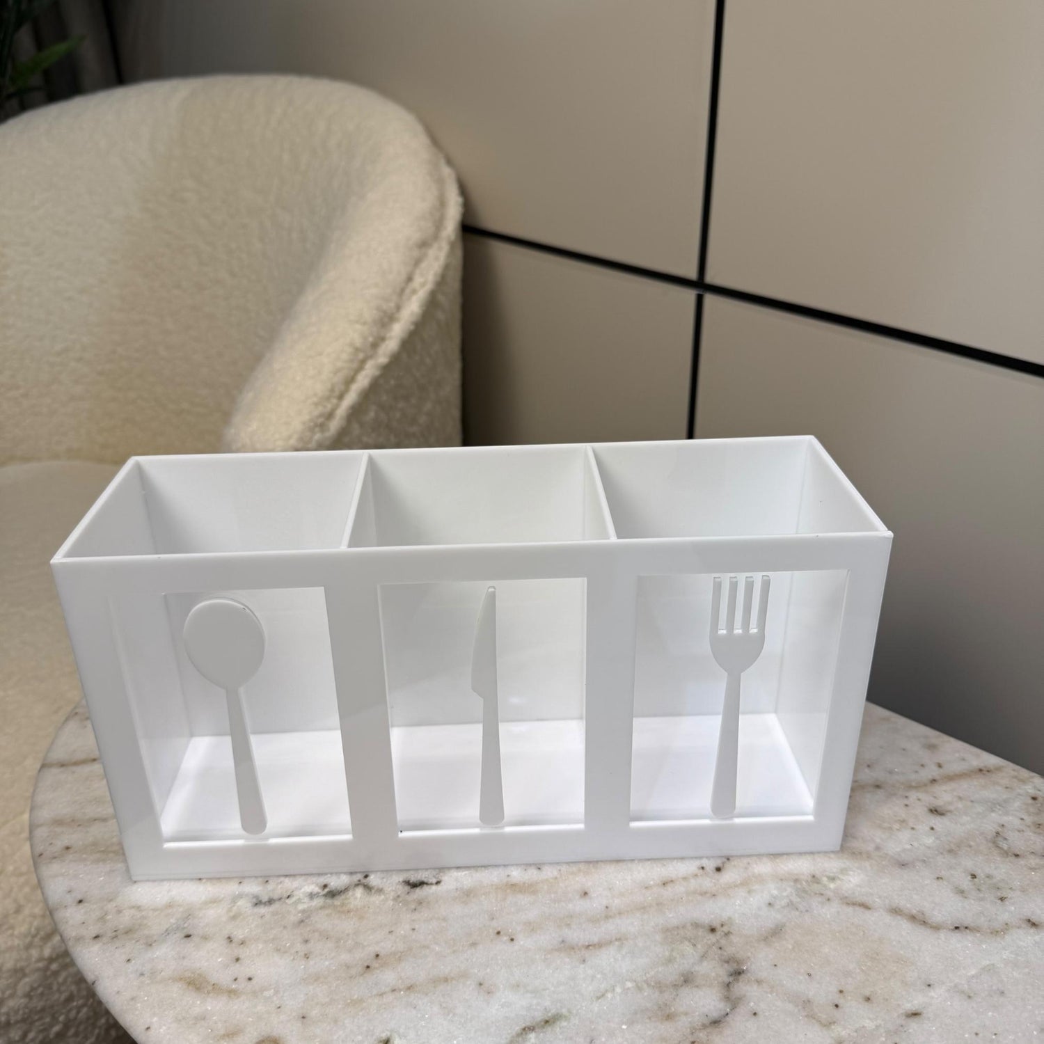 منظّم طولي عملي بتقسيم واضح لثلاث خانات مخصصة للملعقة، الشوكة والسكين. يسهّل عملية التقديم والتنظيم في ركن السفرة أو المطبخ. تصميمه الشفاف مع الإطارات الملونة يضيف لمسة ترتيب راقية ومريحة للنظر.