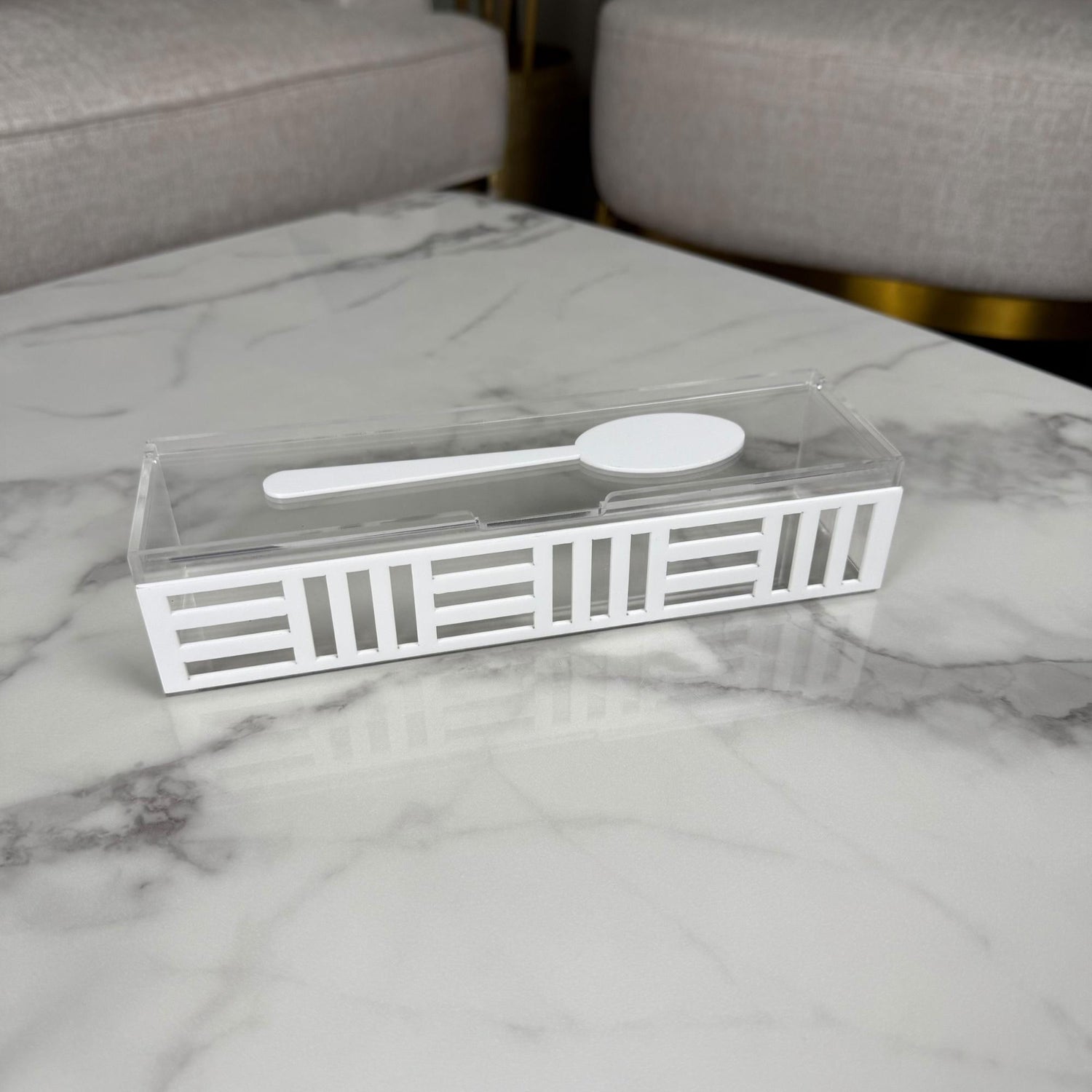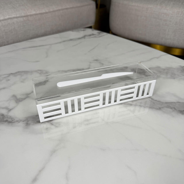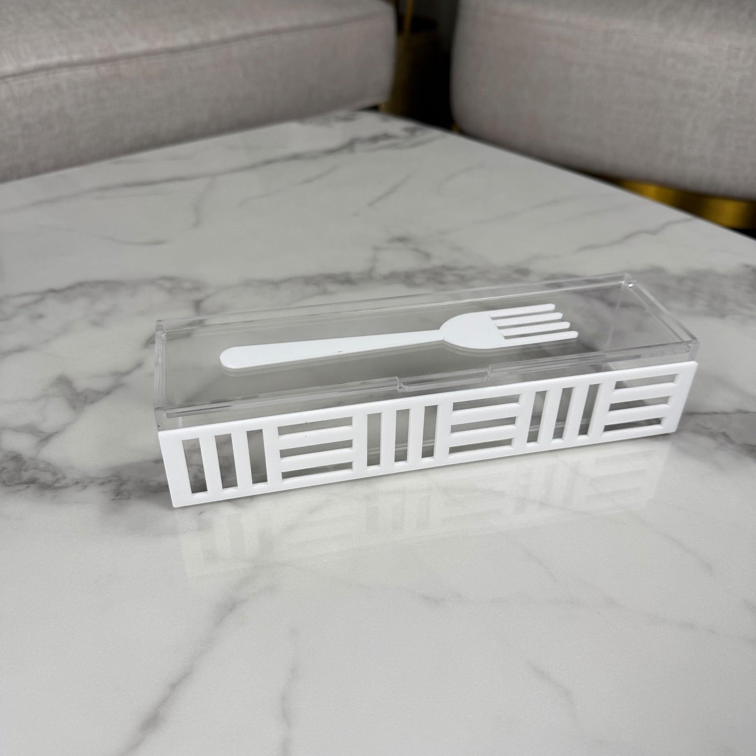 منظّمات راقية لأدوات السفرة، بتصميم شبكي أبيض يضيف لمسة فخامة وتنظيم على ركن التقديم. كل قطعة مصنوعة من الأكريليك الشفاف وتتوفر بثلاث خيارات