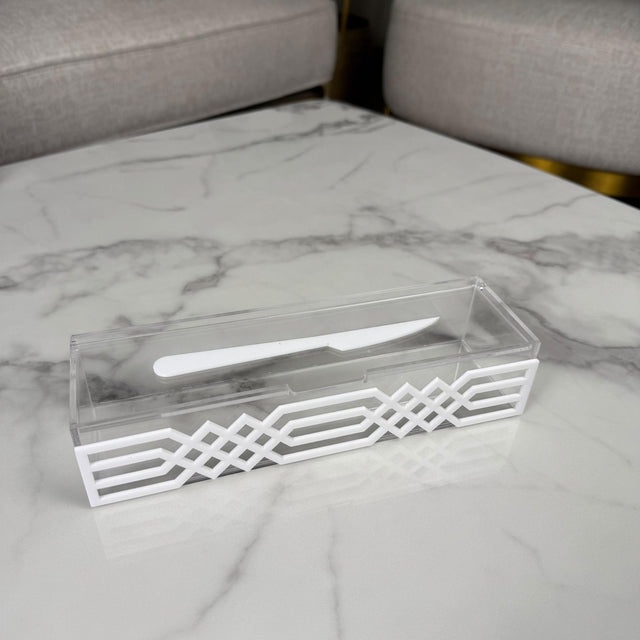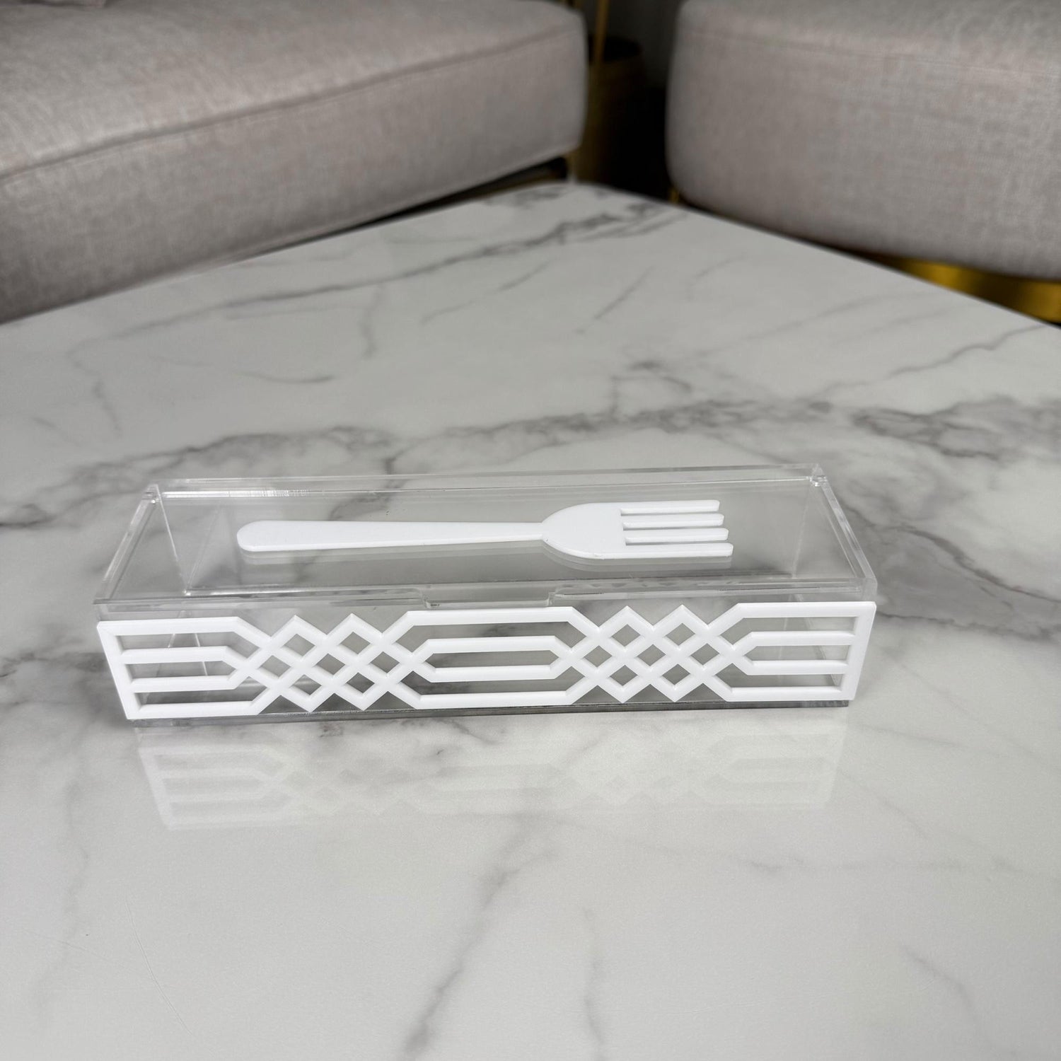مجموعة فاخرة من منظّمات أدوات السفرة، مصمّمة من الأكريليك الشفاف ومزينة بإطار أبيض بزخرفة مستوحاة من التراث الخليجي. كل قطعة مخصصة لأداة وحدة، وتضيف لمسة فنية مرتبة على ركن الضيافة.